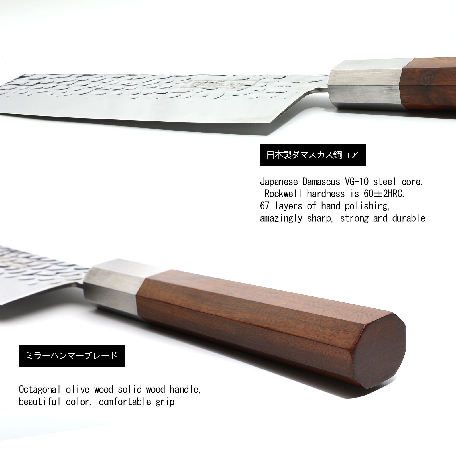 • [HAMMERED BLADE]The blade is hammered by hand. The hammered design on the blade minimizes food sticking. Each side is hand-ground at a 15° angle to enhance the sharpness of the V-shape. To ensure the longevity of the blade, do not wash and cut bones, frozen meat, or other hard materials in the dishwasher.